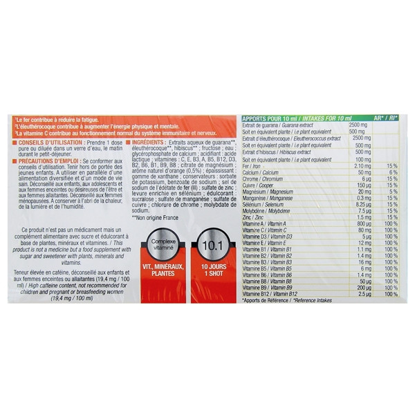 EXTRAITS AQUEUX DE : GUARANA, ELEUTHEROCOQUE, HIBISCUS ; FRUCTOSE ; MINERAUX : GLYCEROPHOSPHATE DE CALCIUM, CITRATE DE MAGNESIUM, SEL DE SODIUM DE L’EDETATE DE FER (III), SULFATE DE ZINC, SULFATE DE MANGANESE, SULFATE DE CUIVRE, CHLORURE DE CHROME ; VITAMINES : C, E, B3, A, D3, B5, B12, B2, B6, B1, B9, B8 ; ACIDIFIANT : ACIDE LACTIQUE ; AROME NATUREL D’ORANGE (0,8 %) ; EPAISSISSANT : GOMME DE XANTHANE ; CONSERVATEURS : SORBATE DE POTASSIUM, BENZOATE DE SODIUM ; LEVURE DE SELENIUM ; MOLYBDATE DE SODIUM ; EDULCORANT : SUCRALOSE ; EAU.