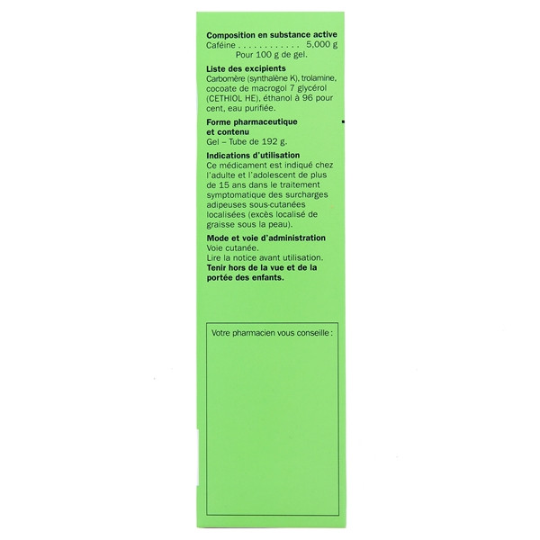 Ce gel contient de la caféine qui, en pénétrant à travers la peau, active la transformation des graisses locales.