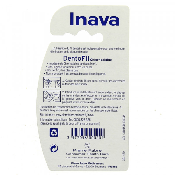 Le fil dentaire Dentifil à la Chlorhexidine de la marque Inava nettoie les espaces inter-dentaires tout en éliminant les bactéries. Il protège les dents de l'apparition des caries et des inflammations de la gencive. Présenté dans une boîte distributrice de 50 m de fil dentaire.