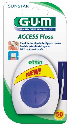 Le fil dentaire Access Floss de la marque Gum est recommandé pour les personnes qui portent des couronnes, bridges ou implants. Le nettoyage des couronnes, bridges et implants est facilité par la présence de passe-fils de rigidité étudiée rigoureusement. Ce fil dentaire se dilate pour permettre de s'adapter à toutes les tailles possibles des espaces interdentaires et permet de nettoyer une plus large surface. Il élimine efficacement la plaque dentaire. Le fil dentaire Access Floss est muni d'un système qui rembobine le fil pour que seule la quantité utile soit déployée.