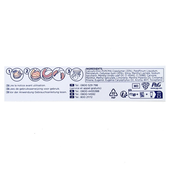 - Nettoyer et sécher la prothèse avant d’appliquer la crème. Étaler ce produit en lignes fines, sans en mettre près des bords. Insérer la prothèse et la maintenir en place pendant 5 secondes.