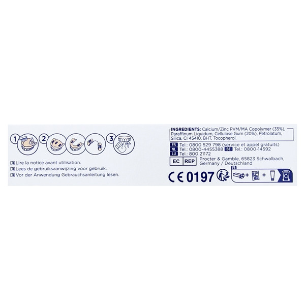 - Mode d’emploi : au préalable, nettoyez et séchez la prothèse. Appliquez la crème en bandes ou en points, loin des bords. Replacez l’appareil dentaire et pressez quelques secondes. Attendez 15 à 30 minutes avant de manger ou boire.