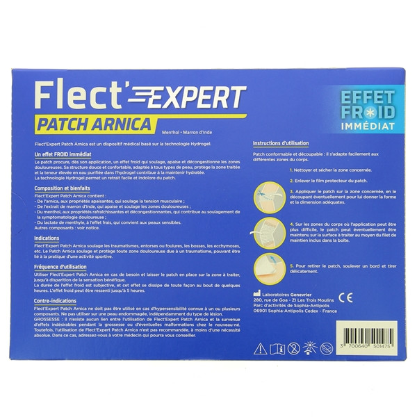 Flect'Expert Patch Arnica est un dispositif médical indiqué pour soulager les douleurs liées à un coup, un bleu ou une bosse par un effet froid immédiat.