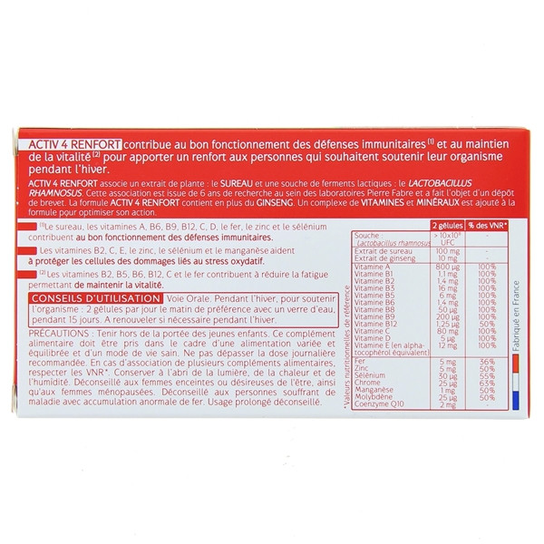 Activ 4 Renfort de Naturactive contient des extraits de plantes (Sureau et Ginseng), une souche de ferments lactiques (Lactobacillus), des minéraux et des vitamines nécessaires pour booster l'énergie et renforcer les défenses immunitaires pendant l'hiver.