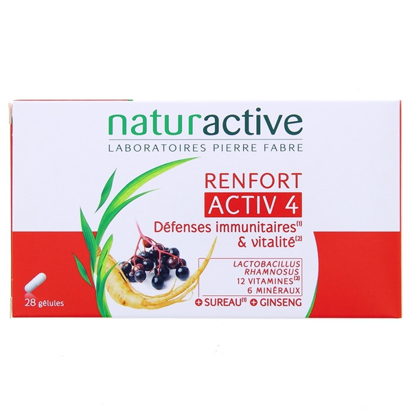 Boîte de 28 gélules, le Sureau, le Ginseng, les vitamines et les minéraux contenus dans Activ 4 Renfort du laboratoire Naturactive agissent sur le bon fonctionnement des défenses immunitaires, la fatigue et la vitalité. Les vitamines, le manganèse et le fer qu'il contient participent au maintien d'un métabolisme énergétique normal. Les autres composants du produit renforcent la protection des cellules contre le stress oxydatif.