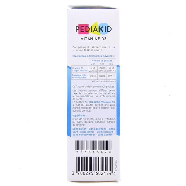 Le complément alimentaire PEDIAKID « Vitamine D3 » favorise la croissance des enfants tout en agissant plus particulièrement sur la structure osseuse et les dents. Ses ingrédients 100 % naturels renforcent aussi les défenses naturelles.
