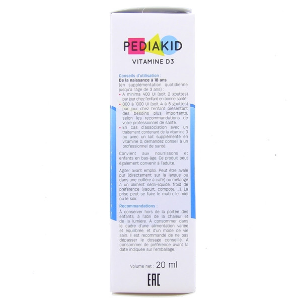 Pediakid Vitamine D3 est conditionné en flacon compte-goutte de 20 ml.