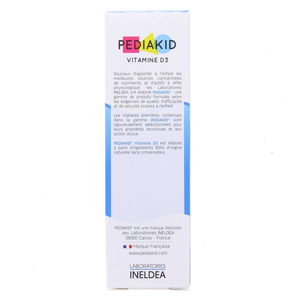 Le complément nutritionnel "Vitamine D3» au goût neutre de la gamme PEDIAKID des laboratoires INELDEA est conçu spécifiquement pour la bonne croissance des enfants. Cette formule permet de faciliter l'assimilation du calcium et du phosphore par le corps.