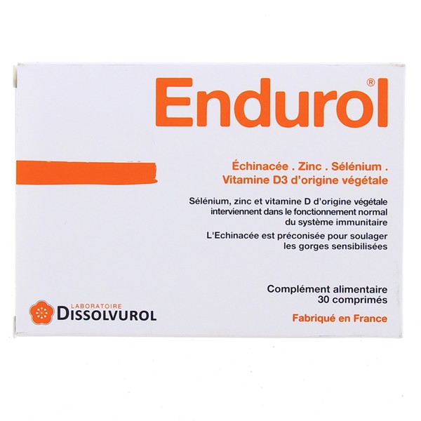 Le complément alimentaire Endurol, du laboratoire Dissolvurol, est spécialement formulé pour renforcer votre système immunitaire. Le sélénium, le zinc et la vitamine D interviennent dans le fonctionnement normal du système immunitaire. L'Echinacée est préconisée pour soulager les gorges sensibilisées.