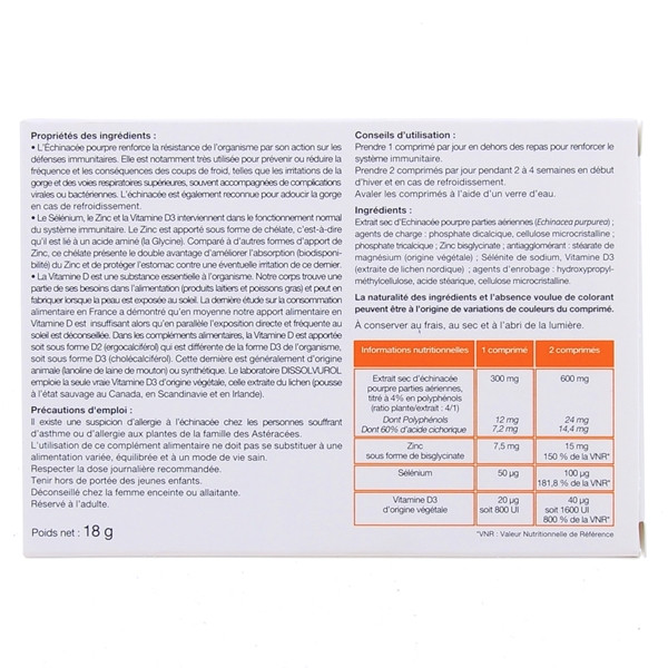 Extrait sec d'Echinacée pourpre parties aériennes (Echinacea purpurea) ; agents de charge : phosphate dicalcique, cellulose microcristalline, phosphate tricalcique ; Zinc bisglycinate ; antiagglomérant : stéarate de magnésium (origine végétale) ; Sélénite de sodium, Vitamine D3 (extraite de lichen nordique); agents d'enrobage : hydroxypropylméthylcellulose, acide stéarique, cellulose microcristalline.
