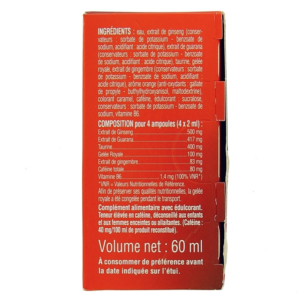 Eau, extrait de ginseng (sorbate de potassium, benzoate de sodium, acide citrique), extrait de guarana (sorbate de potassium, benzoate de sodium, acide citrique), taurine, gelée royale, extrait de gingembre (sorbate de potassium, benzoate de sodium, acide citrique), arôme orange, colorant caramel (E150a), caféine. Edulcorant : sucralose. Conservateurs : sorbate de potassium-benzoate de sodium, vitamine B6.
