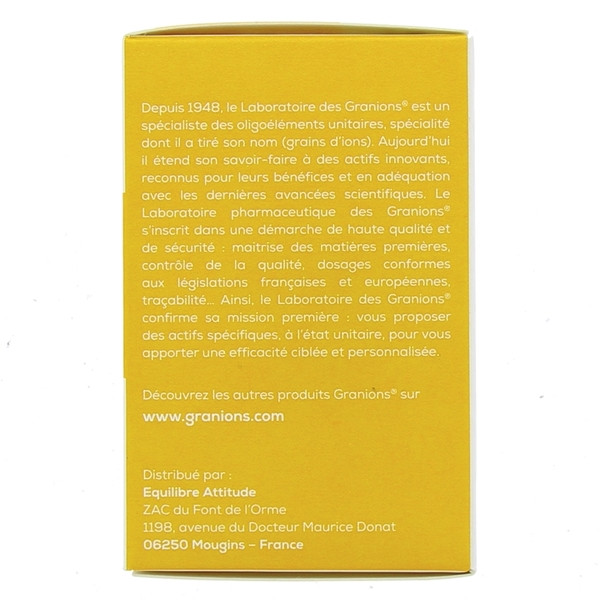 Le complément alimentaire Vitamine D3 proposé par le laboratoire des Granions est destiné à compenser le manque de vitamine D dans l'organisme. Il a été formulé de manière à pouvoir être consommé par les personnes de tous les âges, même celles allaitantes ou en période de ménopause. La vitamine D3 fournie par ce complément alimentaire favorise le développement d'une ossature normal et le maintien du calcium sur les os. Les différents actifs qui caractérisent ce complément alimentaire aident également à entretenir les fonctions musculaires. Ils stimulent et renforcent le système de défense de l'organisme.