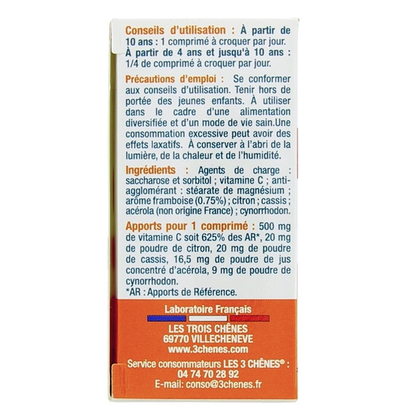 Agents de charge : Saccharose et Sorbitol ; Vitamine C ; Anti-agglomérants : stéarate de magnésium ; Arôme framboise (0,75%) ; Citron ; Cassis ; Acérola (non origine France) ; Cynorrhodon.