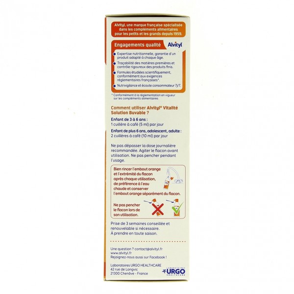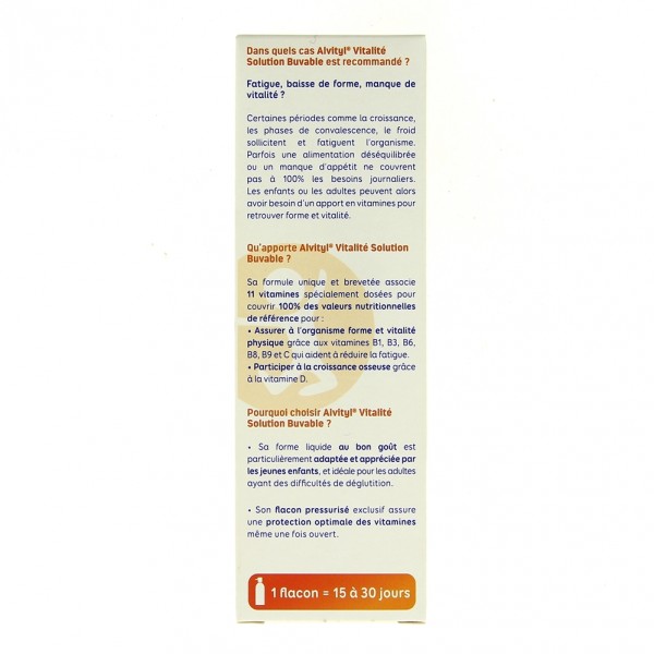 Solution buvable, complément alimentaire multivitaminé. Energétique, contribue au bon fonctionnement du système nerveux. Participe à l'équilibre des os, des dents et à la croissance. Gout fruité. Pour adultes, adolescents et enfants dès 3 ans.