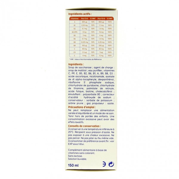 Sirop de saccharose ; Agent de charge : Sirop de maltitol ; Eau purifiée ; Vitamines, C, PP, E, B5, B2, B6, B1, A, B9, B8, D3, Acide ascorbique, Nicotinamide, Acétate de dl-alpha-tocophéryle, Dexpanthénol, Riboflavine 5' phosphate sodique, Chlorhydrate de pyridoxine, Chlorhydrate de thiamine, Palmitate de rétinyle, Acide folique, Biotine, Cholécalciférol ; Émulsifiant : Polysorbate 80 ; Correcteur d'acidité : Hydroxyde de sodium ; Conservateur : Sorbate de potassium ; Arôme prune ; Gaz propulseur : Azote.