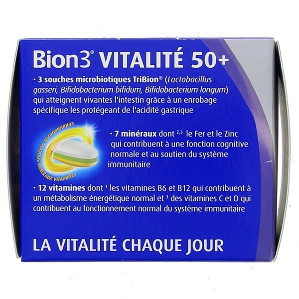 Bion 3 Vitalité 50+ est un complément alimentaire destiné aux personnes de 50 ans et plus. Il se compose de 3 souches microbiotiques, 12 vitamines et 7 minéraux afin d'apporter au métabolisme tous les nutriments nécessaires pour son bon fonctionnement.