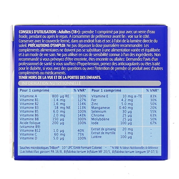 agent de charge cellulose, phosphate de Ca, inuline, ascorbate de Ca, oxyde de Mg, acétate de DL-alphatocophéryle (amidon modifié, maltodextrine) soit vitamine E 10 mg, agent d'enrobage hydroxypropylméthylcellulose, préparation de ferments Tri-Bion (dextrine, amidon de maïs, Lactobacillus gasseri PA 16/8, Bifidobacterium bifidum MF 20/5, Bifidobacterium longum SP 07/3) 100 millions UFC, glucose, antiagglomérants mono et diglycérides d'acides gras d'origine végétale, extrait de racine de ginseng (Panax ginseng) 20 mg, nicotinamide 18 mg, agent de charge polyvinylpyrrolidone, agent d'enrobage hydroxypropylcellulose, sulfate de Fe soit Fe 5 mg, agent de charge polyvinylpolypyrrolidone, acétate de rétinyle (amidon de maïs) soit vitamine A 800 mcg, antiagglomérant sels de Mg d'acides gras d'origine végétale, chlorure de K, D-pantothénate de Ca soit vitamine B5 6 mg, oxyde de Zn soit Zn 5 mg, colorants oxyde de Fe et bleu brillant FCF, agent de charge carboxyméthylcellulose de Na réticulée, sulfate de Mn soit Mn 0,4 mg, sélénate de Na soit Se 30 mcg, cholécalciférol (saccharose, amidon de maïs, huile de palme) soit vitamine D 5 mcg, chlorhydrate de pyridoxine soit vitamine B6 2 mg, mononitrate de thiamine soit vitamine B1 1,4 mcg, lutéine (gélatine, saccharose, huile de palme) 100 mcg, riboflavine soit vitamine B2 1,6 mg, antiagglomérant dioxyde de Si, cyanocobalamine soit vitamine B12 1 mcg, extrait de myrtille (Vaccinium myrtillus) 1 mg, acide folique soit vitamine B9 200 mg, biotine soit vitamine B8 150 mcg, iodure de K soit I 100 mcg, chlorure de Cr soit Cr 25 mcg, molybdate de Na soit Mo 25 mcg, qsp un comprimé.