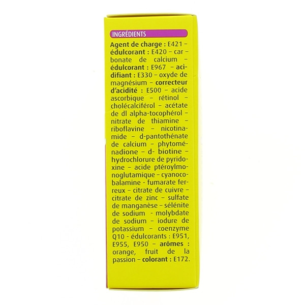 Agent de Charge : Mannitol, Edulcorant : Sorbitol, Carbonate de Calcium, Edulcorant : Xylitol, Acidifiant : Acide Citrique, Oxyde de Magnésium, Correcteur d'Acidité : Carbonate de Calcium, Vitamine C, Fumarate Ferreux, Vitamine A, D, E, B1, B2, B3, B5, K, B8, B6, B9, B12, Citrate de Cuivre, Citrate de Zinc, Sulfate de Manganèse, Sélénite de Sodium, Molybdate de Sodium, Iodure de Potassium, Coenzyme Q10, Edulcorants : Aspartame, Sucralose, Acésulfame de Potassium, Arômes : Orange, Fruit de la Passion, Colorant : Oxyde de Fer Jaune.