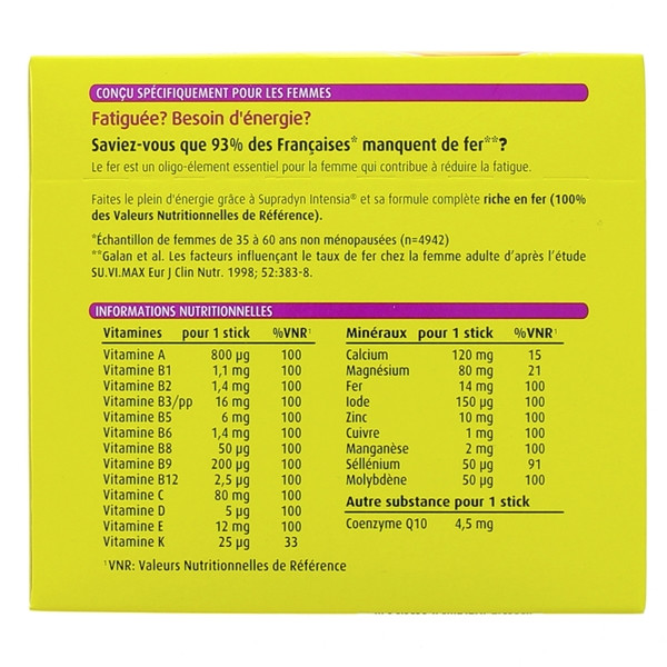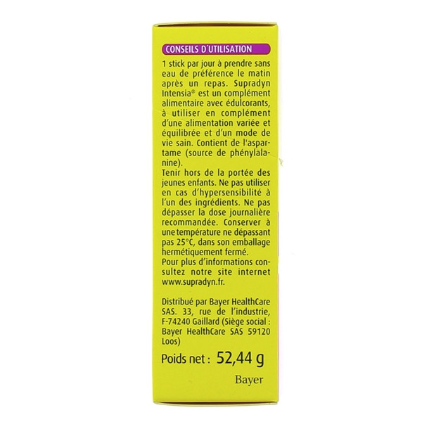 Complément alimentaire disponible en boîte de 20 sticks, Supradyn Intensia est fortement indiqué pour faire face aux coups de pompe de la journée.