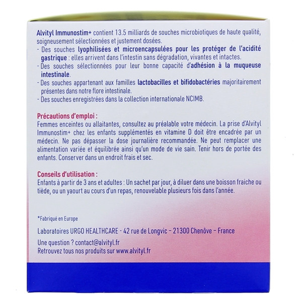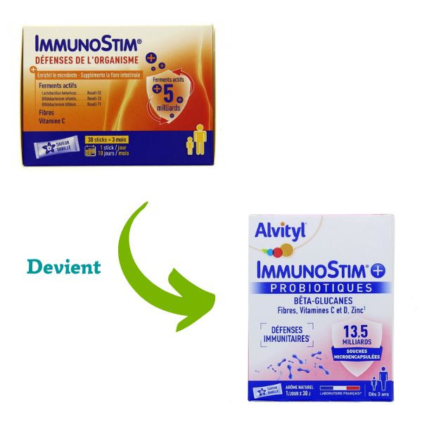 Les Laboratoires Urgo développent le complément nutritionnel Immunostim+ Probiotiques Défenses immunitaires Alvityl, disponible en boîte de 30 sticks à l'arôme naturel, saveur vanille.