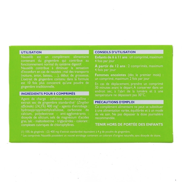 Nausélib est un complément alimentaire à base d'extrait de gingembre. Nausélib permet de lutter contre les états nauséeux, le mal de transport ou les nausées rencontrées en début de grossesse. Convient à partir de 6 ans.
