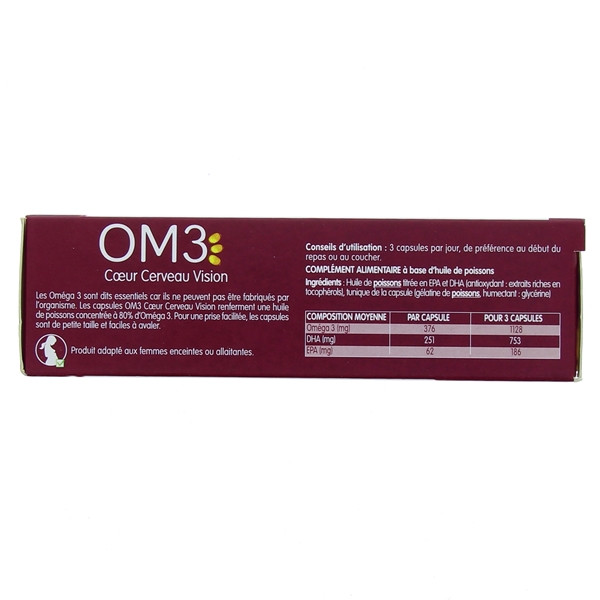 OM3, spécialiste des Oméga-3, vous fait bénéficier de son expertise et de ses formulations de pointe depuis plus de 10 ans. Les Oméga-3 sont dits essentiels car ils ne peuvent pas être fabriqués par l'organisme. Les capsules OM3 Cœur Cerveau Vision renferment une huile de poissons concentrée à 80% d'Oméga-3. Pour une prise facilitée, les capsules sont de petites tailles et faciles à avaler.