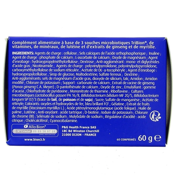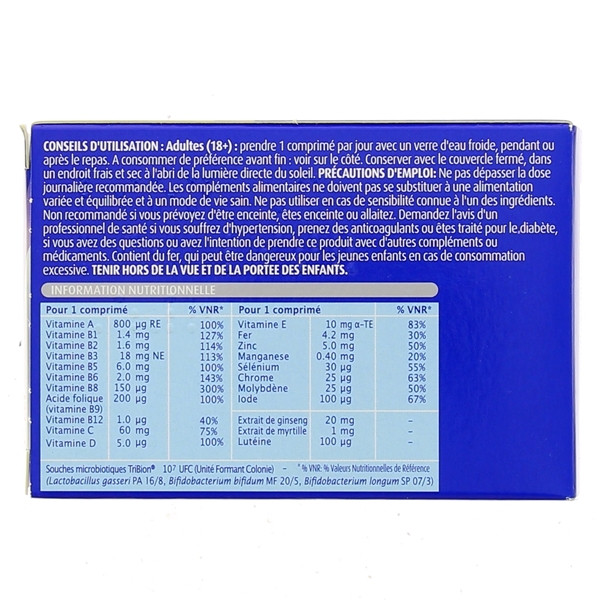 agent de charge cellulose, phosphate de Ca, inuline, ascorbate de Ca, oxyde de Mg, acétate de DL-alphatocophéryle (amidon modifié, maltodextrine) soit vitamine E 10 mg, agent d'enrobage hydroxypropylméthylcellulose, préparation de ferments Tri-Bion (dextrine, amidon de maïs, Lactobacillus gasseri PA 16/8, Bifidobacterium bifidum MF 20/5, Bifidobacterium longum SP 07/3) 100 millions UFC, glucose, antiagglomérants mono et diglycérides d'acides gras d'origine végétale, extrait de racine de ginseng (Panax ginseng) 20 mg, nicotinamide 18 mg, agent de charge polyvinylpyrrolidone, agent d'enrobage hydroxypropylcellulose, sulfate de Fe soit Fe 5 mg, agent de charge polyvinylpolypyrrolidone, acétate de rétinyle (amidon de maïs) soit vitamine A 800 mcg, antiagglomérant sels de Mg d'acides gras d'origine végétale, chlorure de K, D-pantothénate de Ca soit vitamine B5 6 mg, oxyde de Zn soit Zn 5 mg, colorants oxyde de Fe et bleu brillant FCF, agent de charge carboxyméthylcellulose de Na réticulée, sulfate de Mn soit Mn 0,4 mg, sélénate de Na soit Se 30 mcg, cholécalciférol (saccharose, amidon de maïs, huile de palme) soit vitamine D 5 mcg, chlorhydrate de pyridoxine soit vitamine B6 2 mg, mononitrate de thiamine soit vitamine B1 1,4 mcg, lutéine (gélatine, saccharose, huile de palme) 100 mcg, riboflavine soit vitamine B2 1,6 mg, antiagglomérant dioxyde de Si, cyanocobalamine soit vitamine B12 1 mcg, extrait de myrtille (Vaccinium myrtillus) 1 mg, acide folique soit vitamine B9 200 mg, biotine soit vitamine B8 150 mcg, iodure de K soit I 100 mcg, chlorure de Cr soit Cr 25 mcg, molybdate de Na soit Mo 25 mcg, qsp un comprimé.