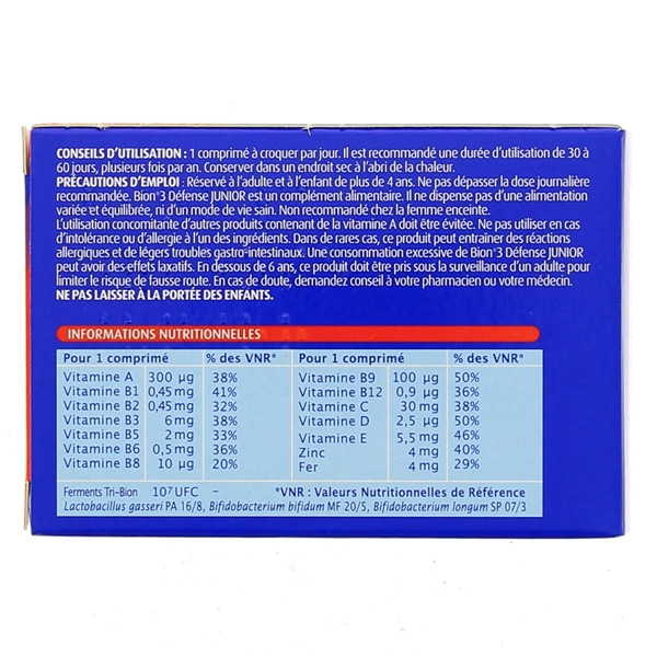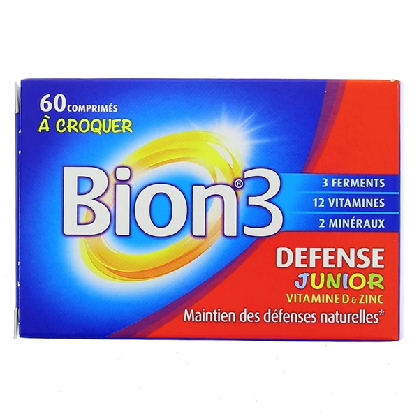 Bion 3 Défense à Croquer est utilisable dès 4 ans. Il est enrichi en vitamines D, A et en fer pour correspondre aux besoins de l'enfant. Bion 3 Défense à croquer aide au maintien des défenses naturelles de l'organisme.