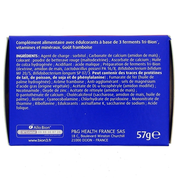 Edulcorants : sorbitol, acésulfame K, saccharine de sodium, minéraux : carbonate de calcium, fumarate de fer, oxyde de zinc, vitamines : ascorbate de calcium, acétate de DL-tocophérol, nicotinamide, pantothénate de calcium, chlorydrate de pyridoxine, nitrate de thiamine, riboflavine, acétate de rétinol, acide folique, cholécalciférol, cyanocobalamine, biotine, colorant : poudre de betterave rouge, huiles et graisses végétales, acidifiant : acide malique, amidon de maïs, anti-agglomérants : sels de magnésium et d'acides gras, arôme framboise, dextrine, maltodextrine, préparation de culture probiotique (lactobacillus gasseri PA 16/8, bifidobacterium bifidum MF 20/5, bifidobacterium longum SP 07/3), saccharose.