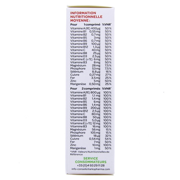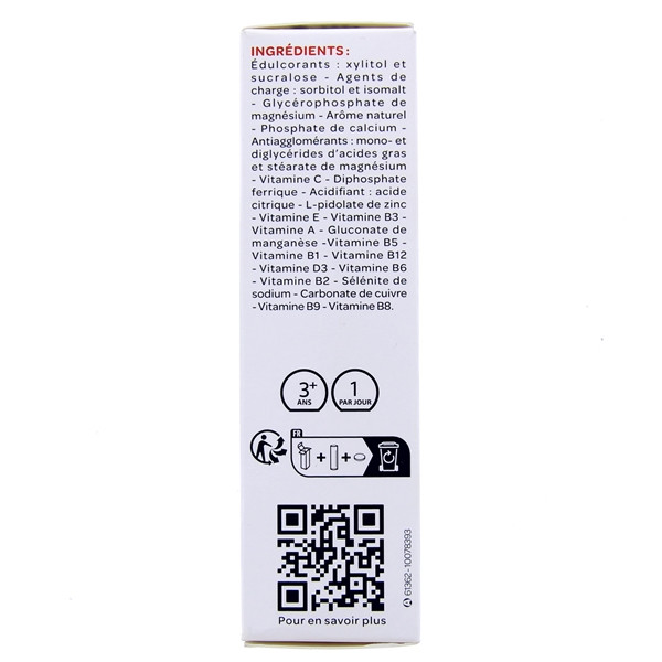 Édulcorants : Xylitol et Sucralose, Agents de charge : Sorbitol et Isomalt, Glycérophosphate de magnésium, Arôme naturel, Phosphate de calcium, Antiagglomérants : Mono et Diglycérides d'acides gras et Stéarate de magnésium, Vitamine C, Diphosphate ferrique, Acidifiant : Acide citrique, L-pidolate de zinc, Vitamine E, Vitamine B3, Vitamine A, Gluconate de manganèse, Vitamine B5, Vitamine B1, Vitamine B12, Vitamine D3, Vitamine B6, Vitamine B2, Sélénite de sodium, Carbonate de cuivre, Vitamine B9, Vitamine B8.