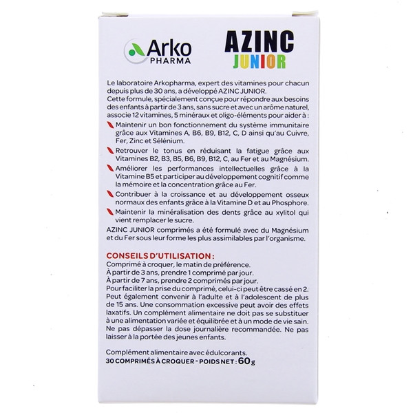 Le formule d'Azinc vitalité Junior répond aux besoins et au rythme de la vie actif des enfants : rentrée scolaire, examen, activité sportive et culturelle. Une prise de deux comprimés par jour permet d'agir au niveau du tonus, de la concentration, de la croissance. Azinc vitalité Junior aide aussi au bon fonctionnement du système immunitaire et au maintien de la minéralisation des dents grâce au xylitol.