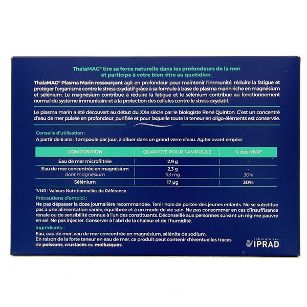 Le plasma marin est un concentré d’eau de mer puisée en profondeur, purifiée et qui conserve toute sa teneur en oligo-éléments. Il a été découvert au XXème siècle par le biologiste René Quinton qui a constaté que la teneur en oligo-élément du plasma sanguin était semblable à celle de l’eau de mer. Les Laboratoires IPRAD se sont basés sur cette découverte à laquelle ils ont ajouté du magnésium et du sélénium pour formuler le concept unique de THALAMAG Plasma Marin.
