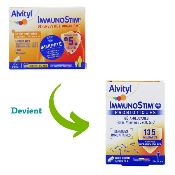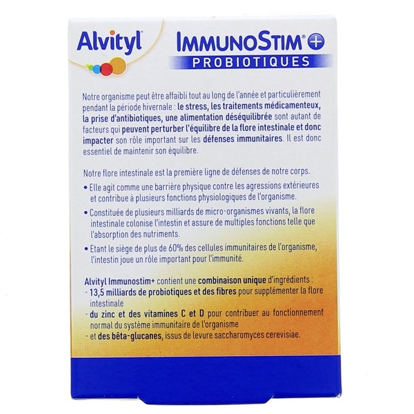 Alvityl ImmunoStim+ Probiotiques est constitué de probiotiques, de fibres, de zinc, de vitamines C & D et des bêta-glucanes pour favoriser les défenses immunitaires de l'organisme.