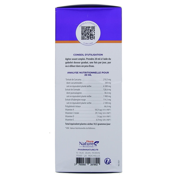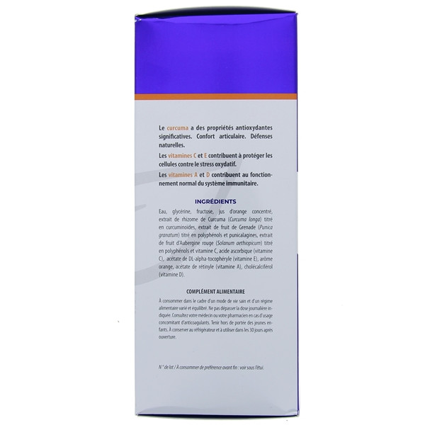 Eau - Glycérine - Fructose - Jus d’orange concentré - Extrait de rhizome de curcuma (Curcuma longa) titré en curcuminoïdes - Extrait de fruit de grenade (Punica granatum) titré en polyphénols et punicalagines - Extrait de fruit d’aubergine rouge (Solanum aethiopicum) titré en polyphénols et vitamine C - Acide ascorbique (vitamine C) - Arôme naturel orange - Acétate de DL-alpha-tocophéryle (vitamine E) - Acétate de rétinyle (vitamine A) - Cholécalciférol (vitamine D).