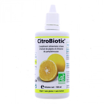 Le complément alimentaire en solution buvable Citrobiotic est élaboré à base d'extraits de pépins de pamplemousse. Ce produit est entièrement exempt de conservateur artificiel et de pesticide et est reconnu pour ses vertus antibactériennes grâce aux extraits qu'il contient.