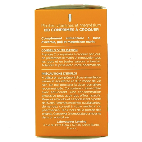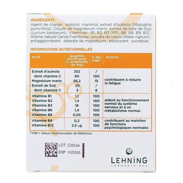 Ces comprimés associent des vitamines (C, B1, B2, B3, B6, B8, B9, B12), du magnésium, des extraits d’acérola et des baies de goji qui sont des ingrédients réputés pour leurs richesses nutritionnelles. Ces composants contribuent à soutenir l’organisme, en particulier dans les phases de surcharge mentale ou physique comme les révisions ou les entraînements intensifs. Ils peuvent aussi être utiles lors des projets professionnels ou pour une simple fatigue saisonnière.