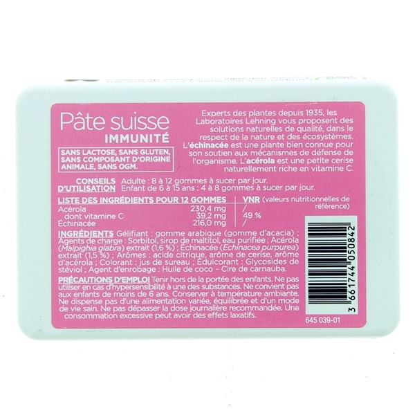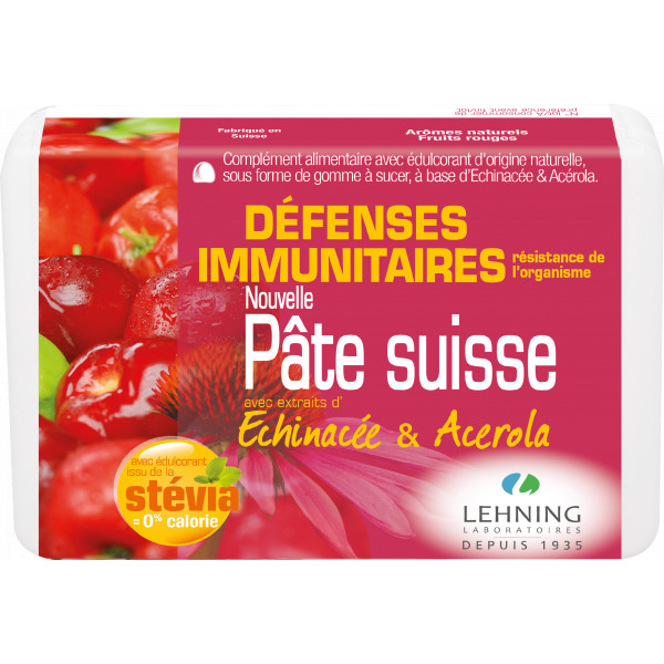Lehning Pâte suisse Défenses immunitaires résistance de l'organisme avec extraits d'Echinacée & Acerola est un complément alimentaire avec édulcorant d'origine naturelle, sous forme de gomme à sucer, à base d'Echinacée & Acerola.
