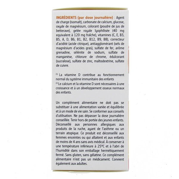 Agent de charge (isomalt), carbonate de calcium, glucose, oxyde de magnésium, colorant (poudre de jus de betterave), gelée royale lyophilisée (40 mg équivalent à 120 mg fraîche), vitamines (C, E, B3, B5, A, D, B6, B1, B2, B12, B9, B8), correcteur d'acidité (acide citrique), antiagglomérant (sels de magnésium d'acide gras), sulfate de fer, arôme grenadine, sélénite de sodium, sulfate de manganèse, chlorure de chrome, édulcorant (sucralose), sulfate de zinc, maltodextrine, sulfate de cuivre.