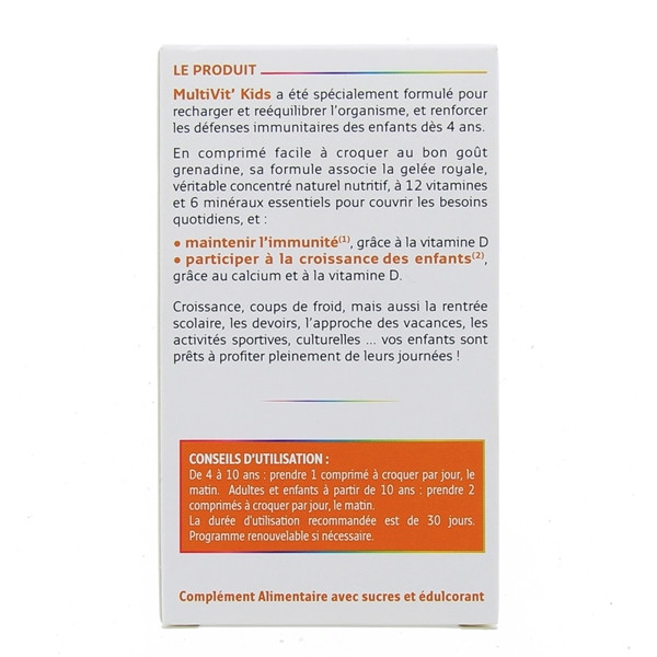 Forté Pharma MultiVit'Kids Défenses est un complément alimentaire spécialement formulé pour recharger et rééquilibrer l'organisme et renforcer les défenses immunitaires des enfants dès 4 ans. Goût grenadine.