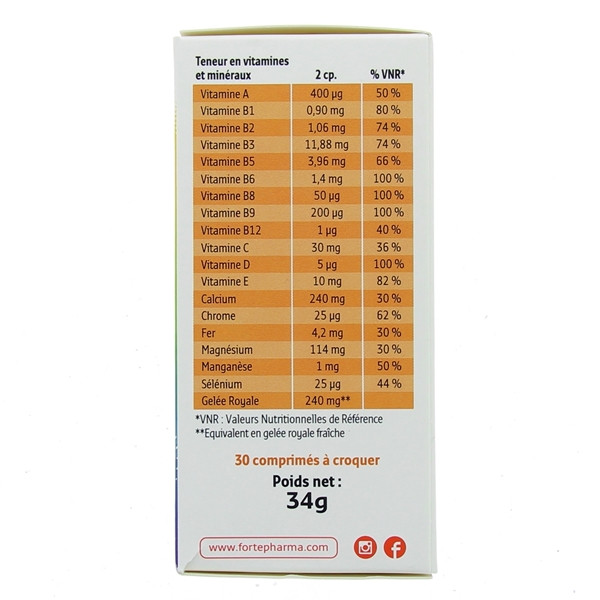 En comprimé facile à croquer au bon goût grenadine, sa formule associe la gelée royale, véritable concentré naturel nutritif à 12 vitamines et 6 minéraux essentiels pour couvrir les besoins quotidiens, et :
