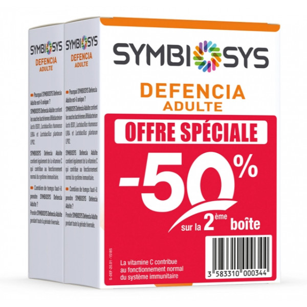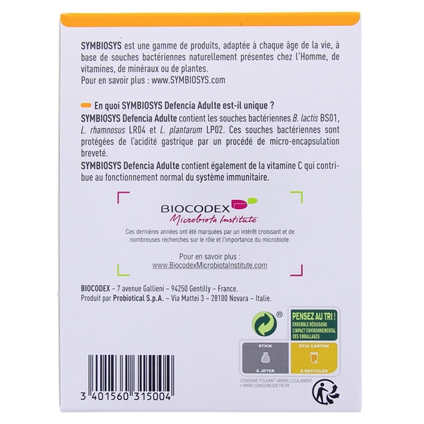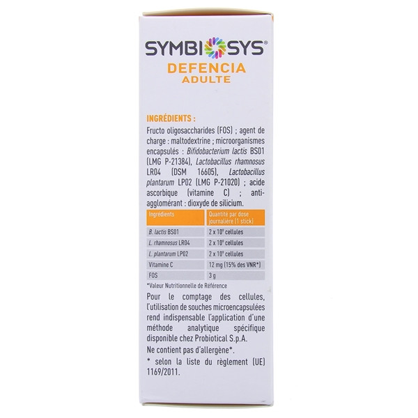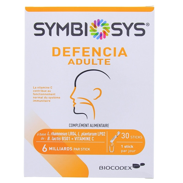 Symbiosys Defencia Adulte contient les souches bactériennes Bifidobacterium lactis BS01, Lactobacillus rhamnosus LR04 et Lactobacillus plantarum LP02.Symbiosys Defencia Adulte contient également de la vitamine C qui contribue au fonctionnement normal du système immunitaire. Pour une efficacité optimale, il est recommandé de prendre Symbiosys Defencia Adulte pendant toute la période hivernale.