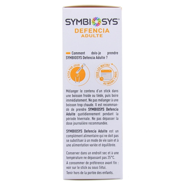 Symbiosys Defencia Adulte est un complément alimentaire contenant 3 souches micro-encapsulées et de la vitamine C. Chaque stick contient 6 milliards de bactéries et 12 mg de vitamine C. Symbiosys Defencia Adulte est idéal en période hivernale pour booster les défenses immunitaires.