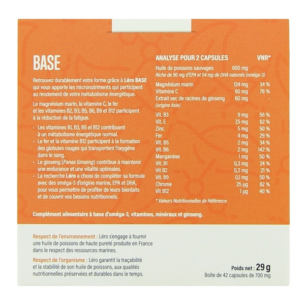Les nutriments contenus dans les capsules Léro Base stimulent le métabolisme énergétique et permettent de retrouver rapidement la forme, notamment en période de surcroit d'activité.