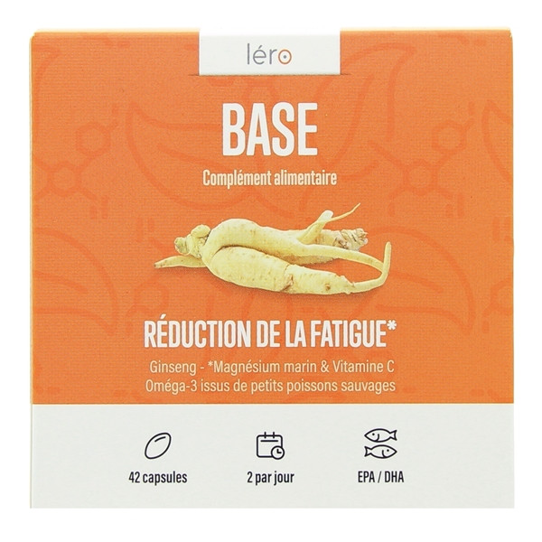 Le complément alimentaire Léro Base Réduction de la fatigue est présenté en boîte de 42 capsules.