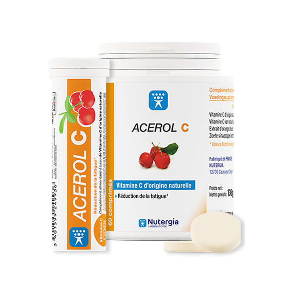 ACEROL C est composé d’un extrait d’Acérola riche en vitamine C d’origine naturelle qui contribue à la réduction de la fatigue et au fonctionnement normal des systèmes nerveux et immunitaire, participe au métabolisme énergétique, protège les cellules contre le stress oxydatif et augmente l’absorption du fer.