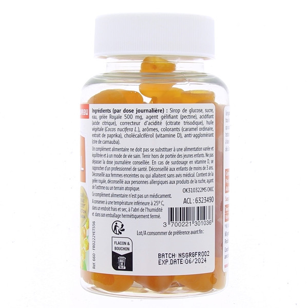 Sirop de glucose, Sucre, Eau, Gelée Royale (500 mg par dose journalière), Agent gélifiant (Pectine), Acidifiant (Acide citrique), Correcteur d'acidité (Citrate trisodique), Huile végétale (Cocos nucifera L.), Arômes, Colorants (Caramel ordinaire, Extrait de paprika), Cholécalciférol (Vitamine D), Anti-agglomérant (Cire de carnauba).