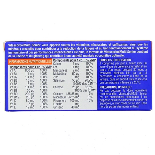 Vitascorbol Multi Senior est un complément alimentaire tricouche à libération prolongée pour réduire la fatigue et contribuer au bon fonctionnement du système immunitaire et des performances intellectuelles.