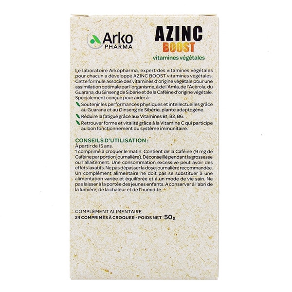 Azinc® boost vitamines végétales est un complément alimentaire élaboré par les laboratoires Arkopharma. Conçu avec une formule 100 % d’origine végétale, ce produit assure une meilleure assimilation des vitamines et des minéraux.