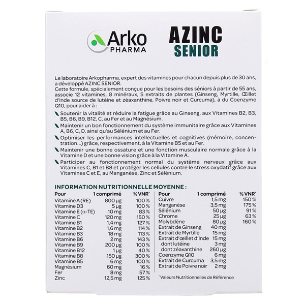 Azinc Senior associe 12 vitamines, 8 minéraux, 5 extraits de plantes à du Coenzyme Q10. Spécialement conçu pour les besoins des seniors, ce complément alimentaire aide à retrouver forme & vitalité.