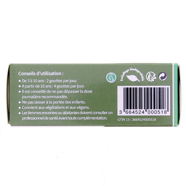 Pour les enfants de 3 à 10 ans, la dose indiquée est de 2 gouttes par jour. À partir de 10 ans, la posologie s’élève à 4 gouttes par jour. Ce complément alimentaire doit être utilisé dans le cadre d’un mode de vie sain et d’un alimentation équilibrée.